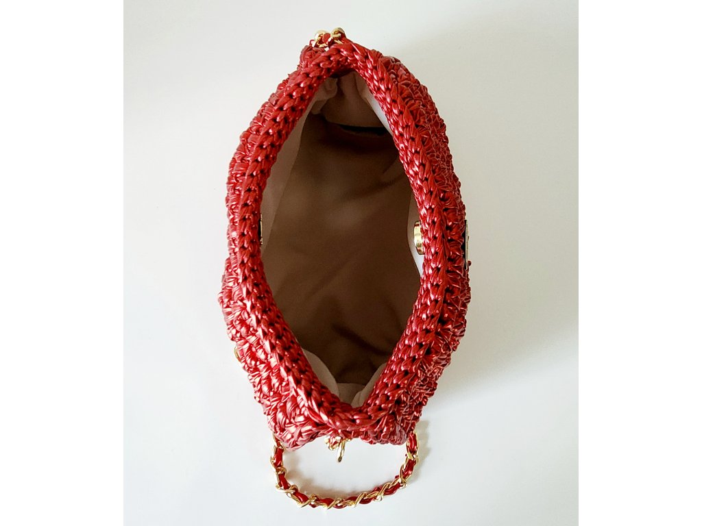 Elegantná crossbody kabelka vyrobená z metalickej polyesterovej priadze, s doplnkami vo farbe zlata. So všitou podšívkou. Retiazka má dĺžku 120 cm.