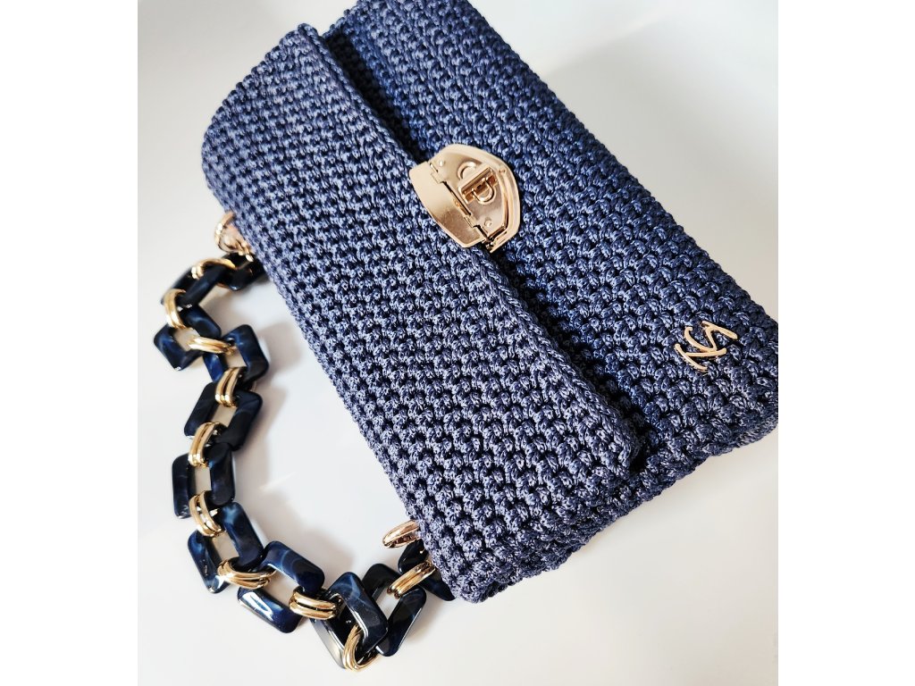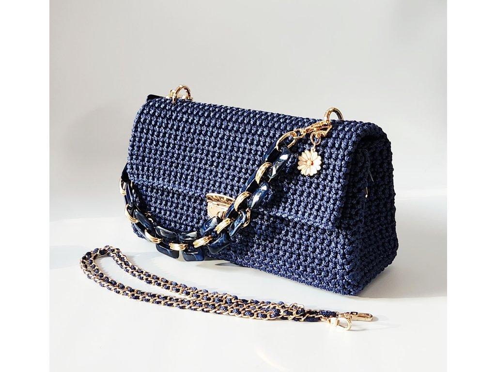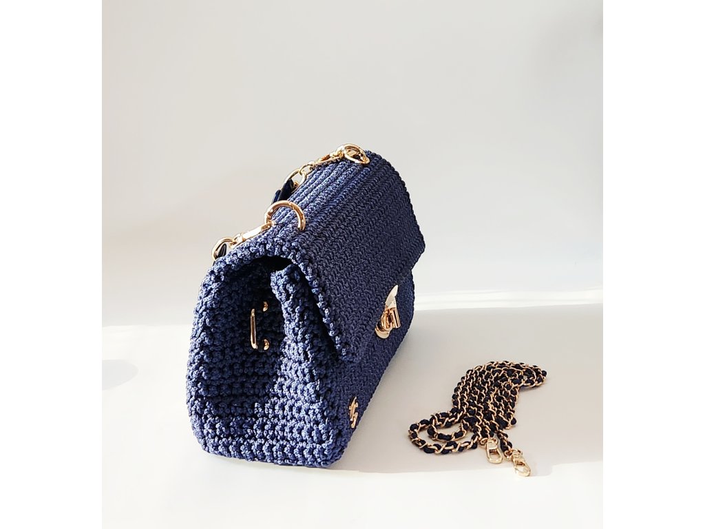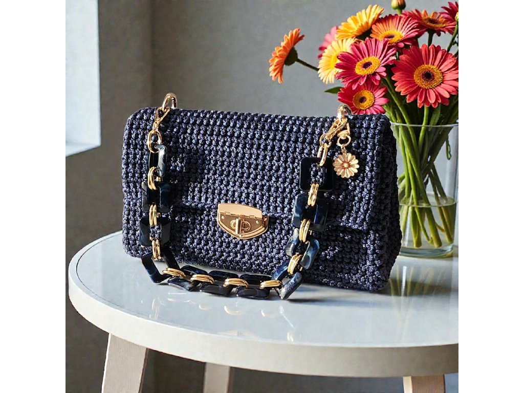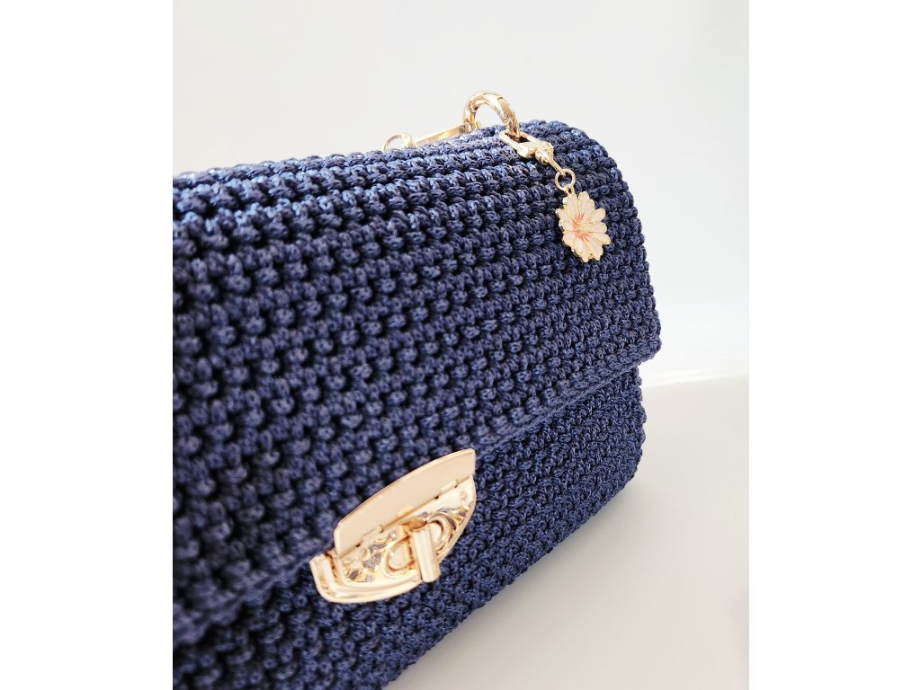 Kabelka Brenda je dokonalou kombináciou štýlu, elegancie a praktickosti. Ručne háčkovaný povrch v odtieni tmavej modrej jej dodáva jedinečný charakter a zaujímavú textúru, ktorá pritiahne pozornosť na prvý pohľad.