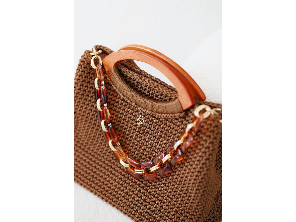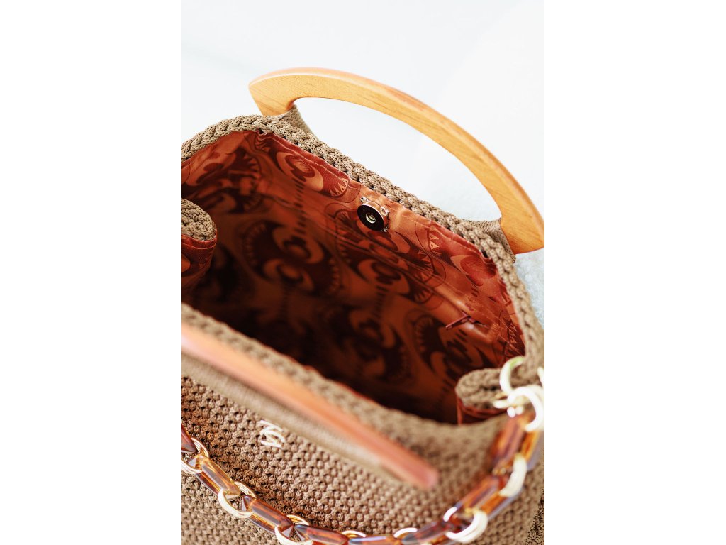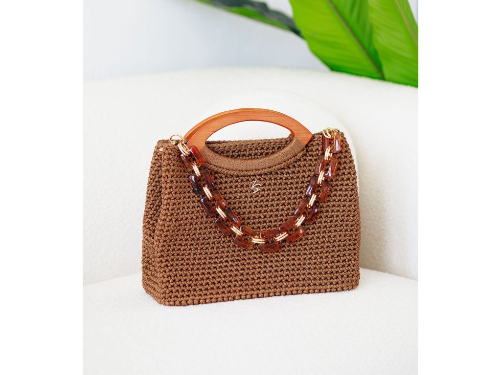 Táto nádherná elegantná kabelka je ideálnym spojením kvalitných materiálov a moderného dizajnu. Vyrobená z kvalitnej polyesterovej priadze s jemným leskom, pôsobí sofistikovane a zároveň nadčasovo. Drevené rúčky dodávajú kabelke jedinečný vzhľad a príjemný dotyk prírody.