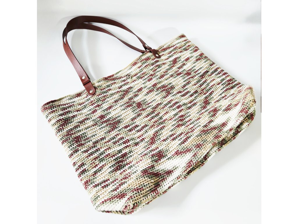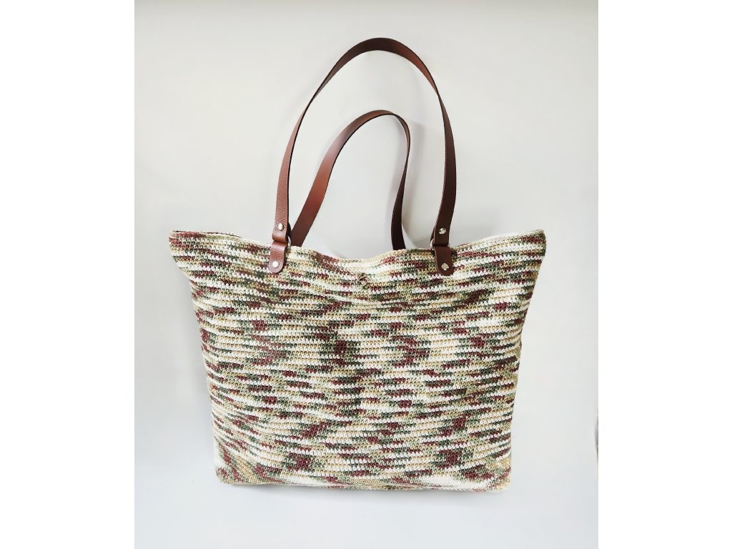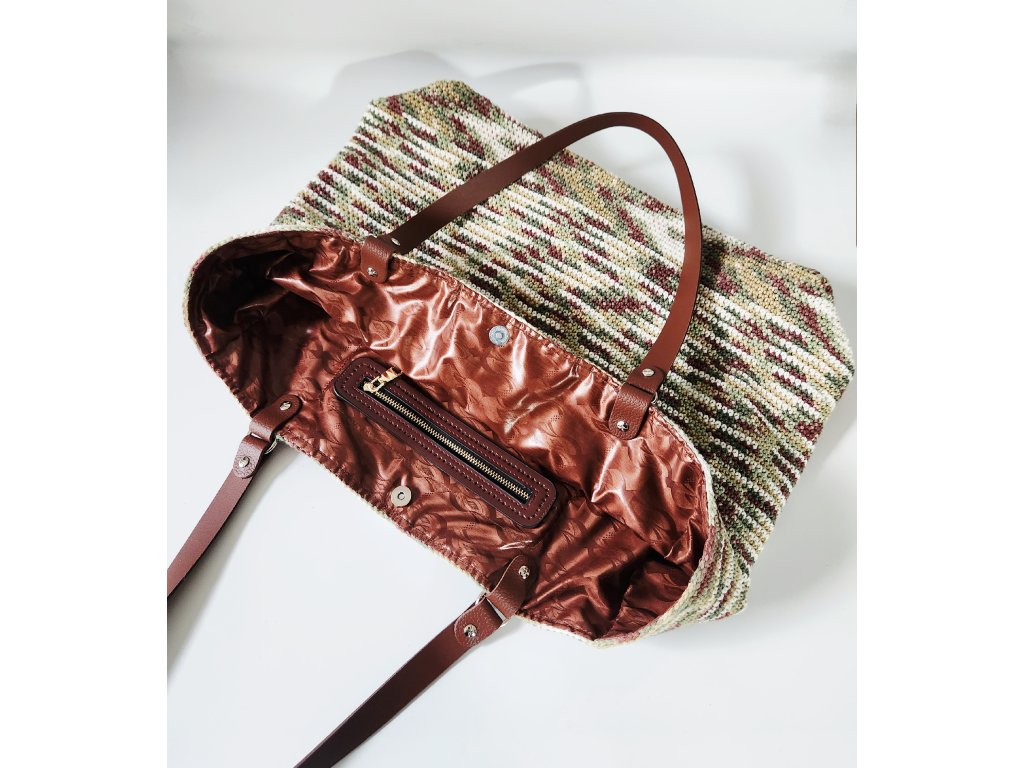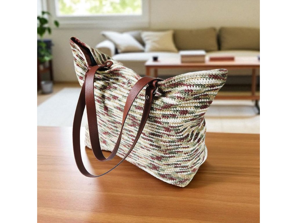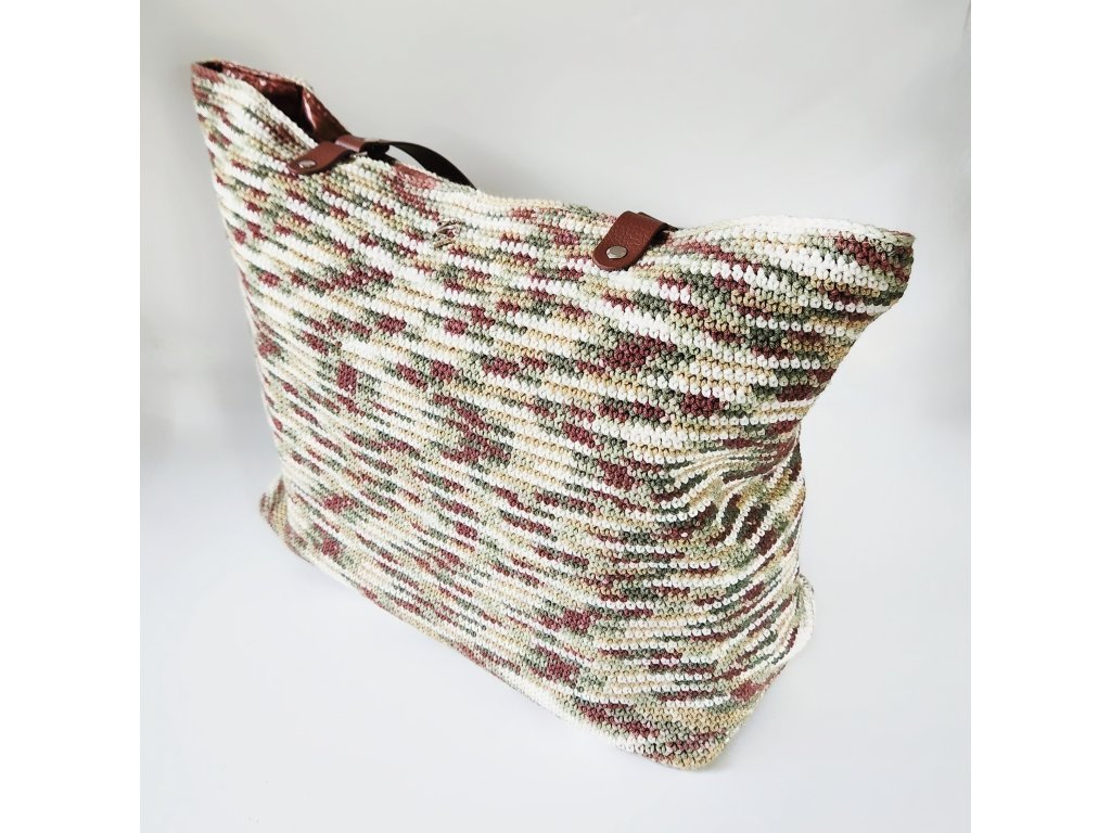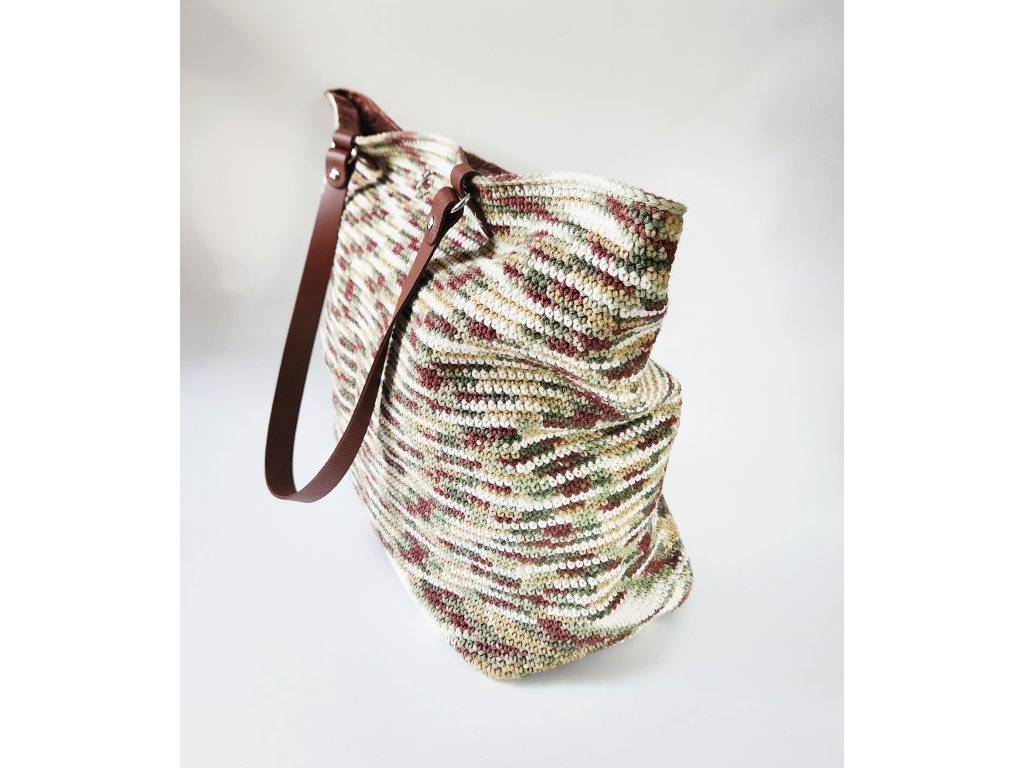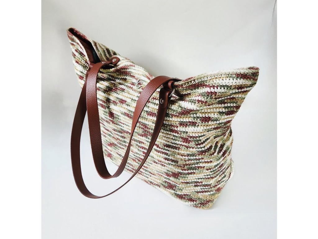 Táto štýlová háčkovaná taška v jedinečnom vzore camouflage je ideálnym doplnkom pre milovníkov módy. Je vybavená vnútornou podšívkou a všitým vreckom, ktoré poskytuje praktické úložné priestory pre vaše cennosti. Vďaka koženým ramenným popruhom s dĺžkou 55 cm je taška pohodlná na nosenie cez rameno. Je priestranná a ľahká, čo z nej robí dokonalého spoločníka na každodenné nosenie. Táto taška kombinuje funkčnosť a štýl, čím zaručuje, že budete vždy v centre pozornosti.