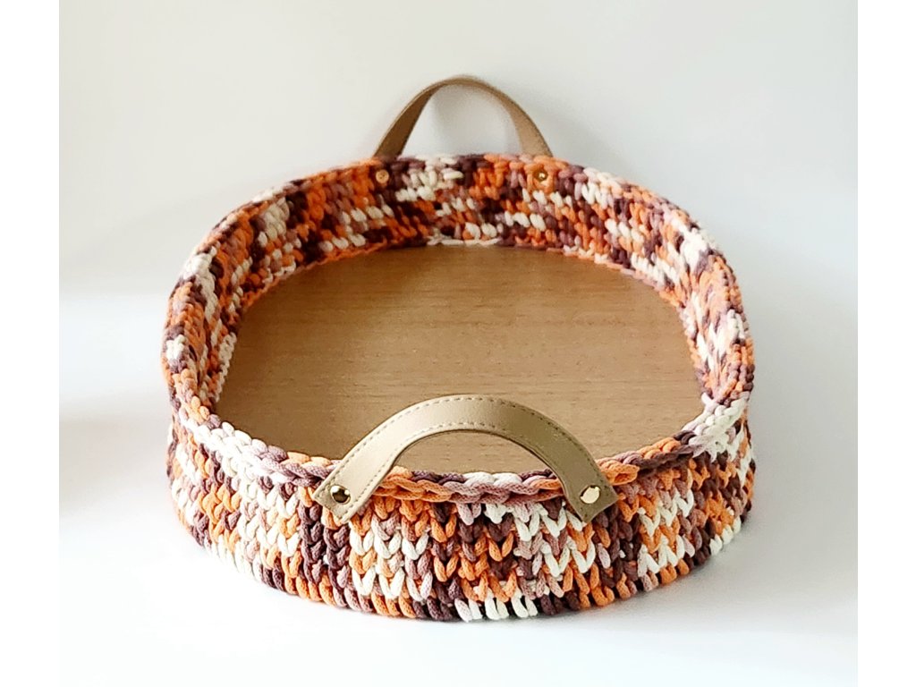 materiál: bavlnená priadza hrúbky 3 mm, dno - HDF laminátová doska hrúbky 3 mm, koženka
